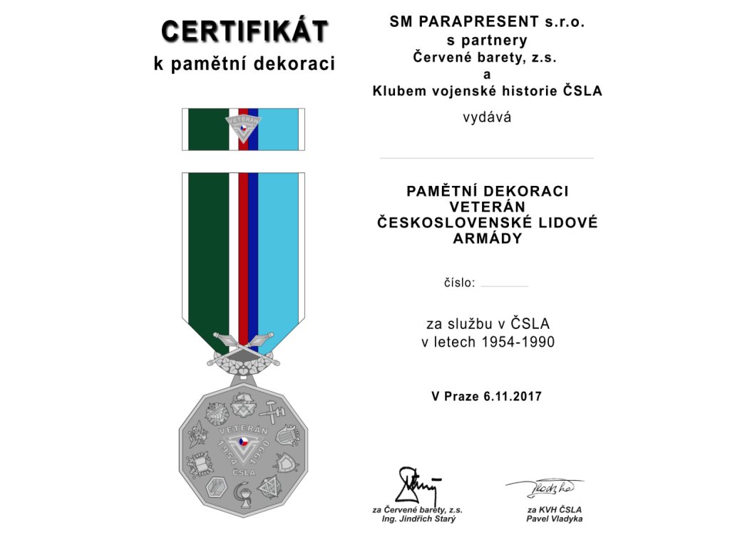 Komplet odznaku se sestává: pamětní dekorace na stuze, 1 x miniaturní stužka s miniaturou na špendlíkový uzávěr, 1 x nositelská miniatura na uchycení 1 pin s trnem proti otočení, certifikát k dekoraci na jméno a plastová etue s průhledným víkem.